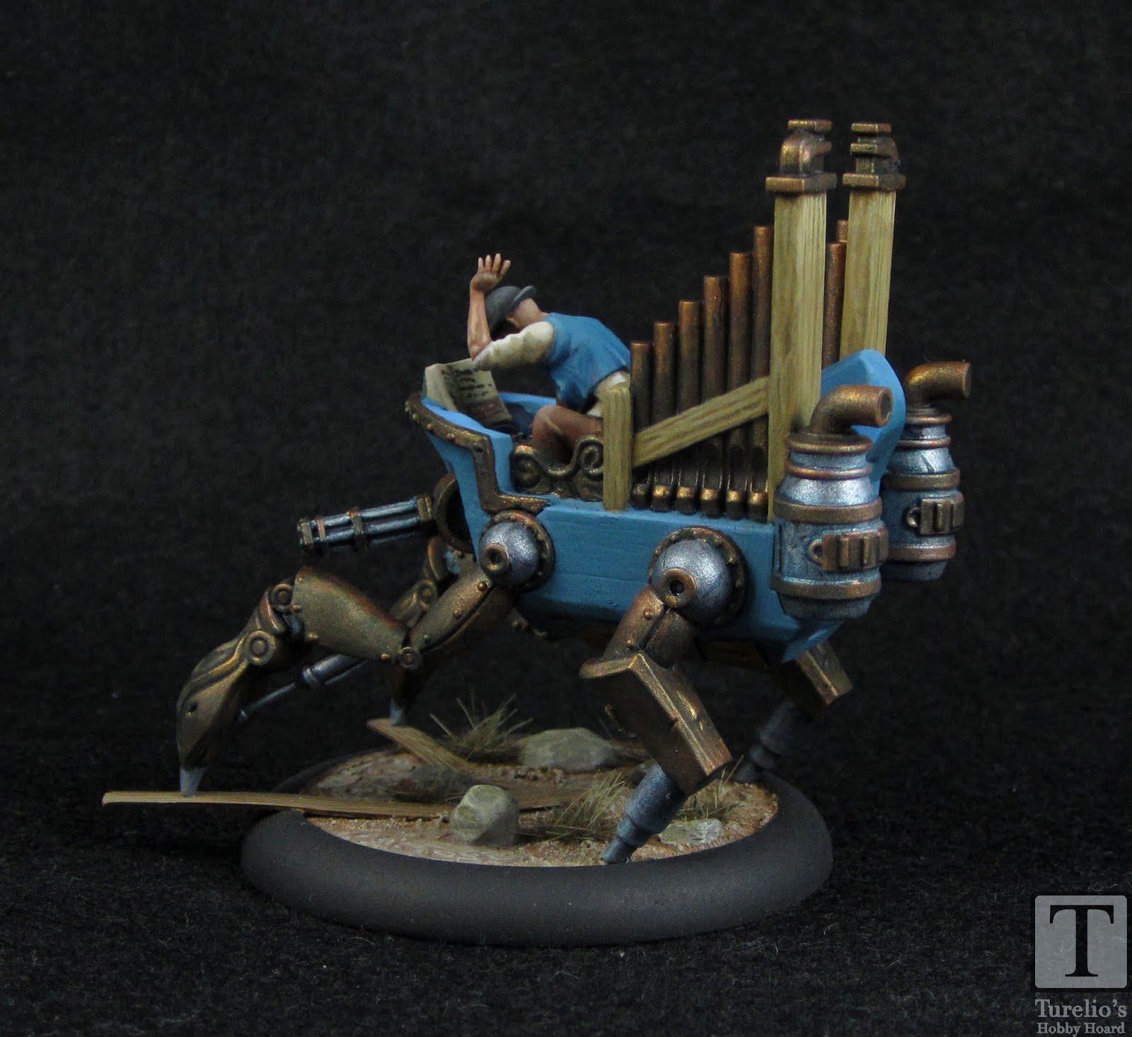 Envy was actually the third member to be started, but one of the last to be finished. I decided to leave the rider (Envy himself) separate to make painting him easier, and I painted the tank later. He also was one of two members who posed an issue with basing - He doesn't fit on the base. If the model was on a flat 50mm disc with straight edges it would just fit, but the Malifaux bases have a lip, so something is going to overhang on the base.